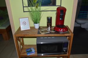 Kühlschrank mit Tiefkühlfach, Herd mit zwei Kochfeldern, Pad-Kaffeemaschine, Toaster,